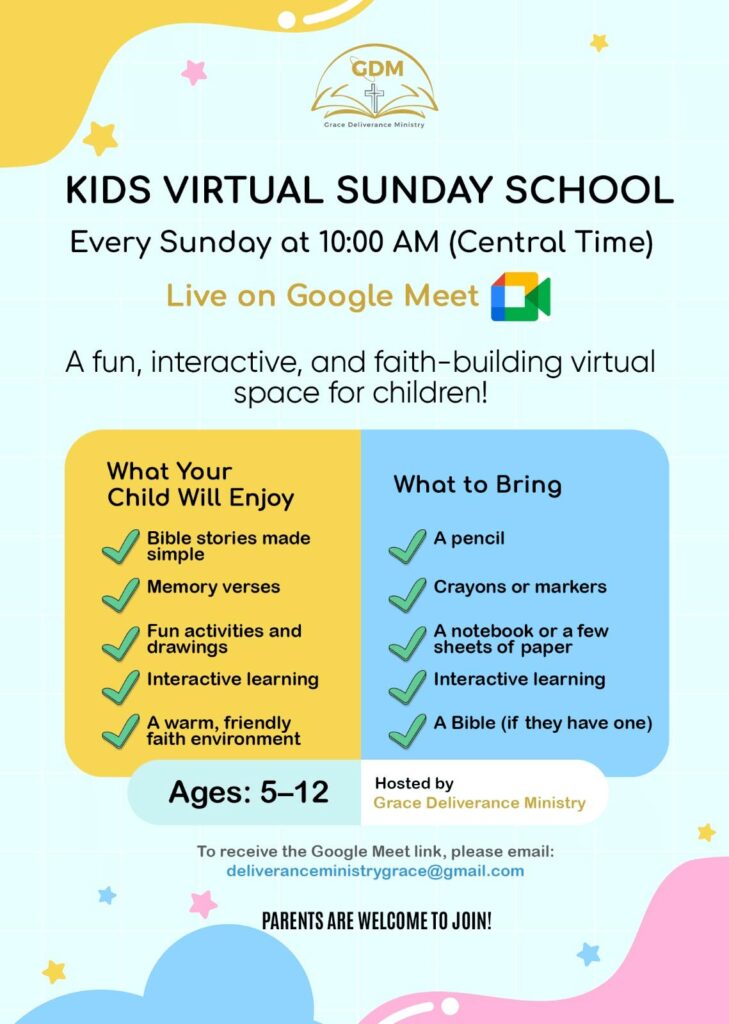 Grace Deliverance Ministry invites children ages 5–12 to a fun, interactive, and faith-building virtual Sunday School class! Our sessions are designed to make Bible learning simple, engaging, and enjoyable for kids.